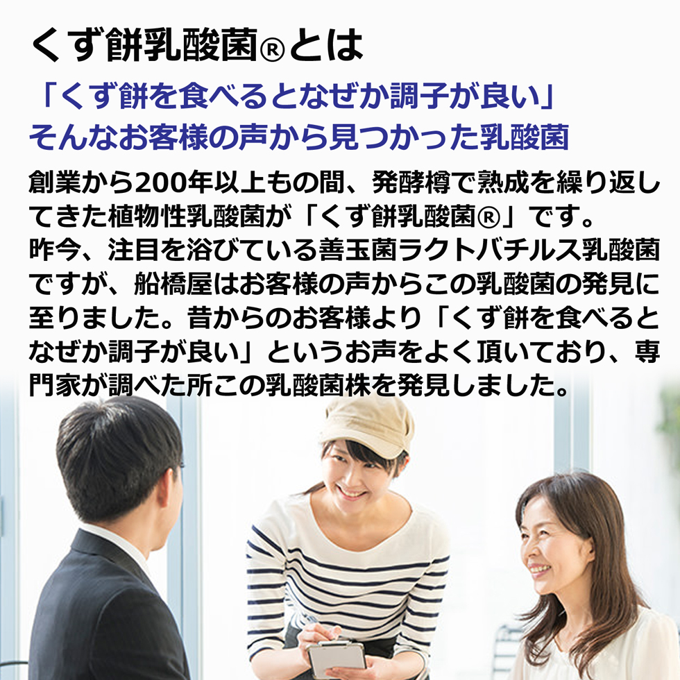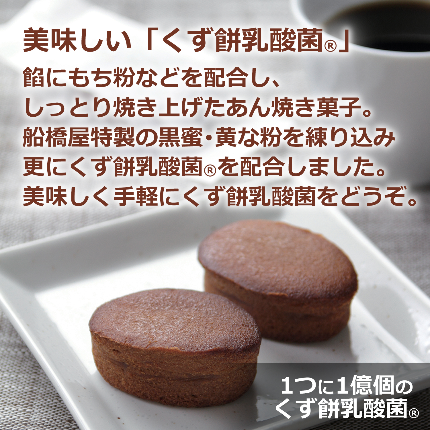 餡にもち粉などを配合し、しっとりと焼き上げたあん焼き菓子。自社の黒蜜、黄な粉を練りこみ、更にくず餅に含まれるくず餅乳酸菌を配合しました。1つ当たり約1億個のくず餅乳酸菌入りです。ホワイトデーのプレゼントに最適です。 |