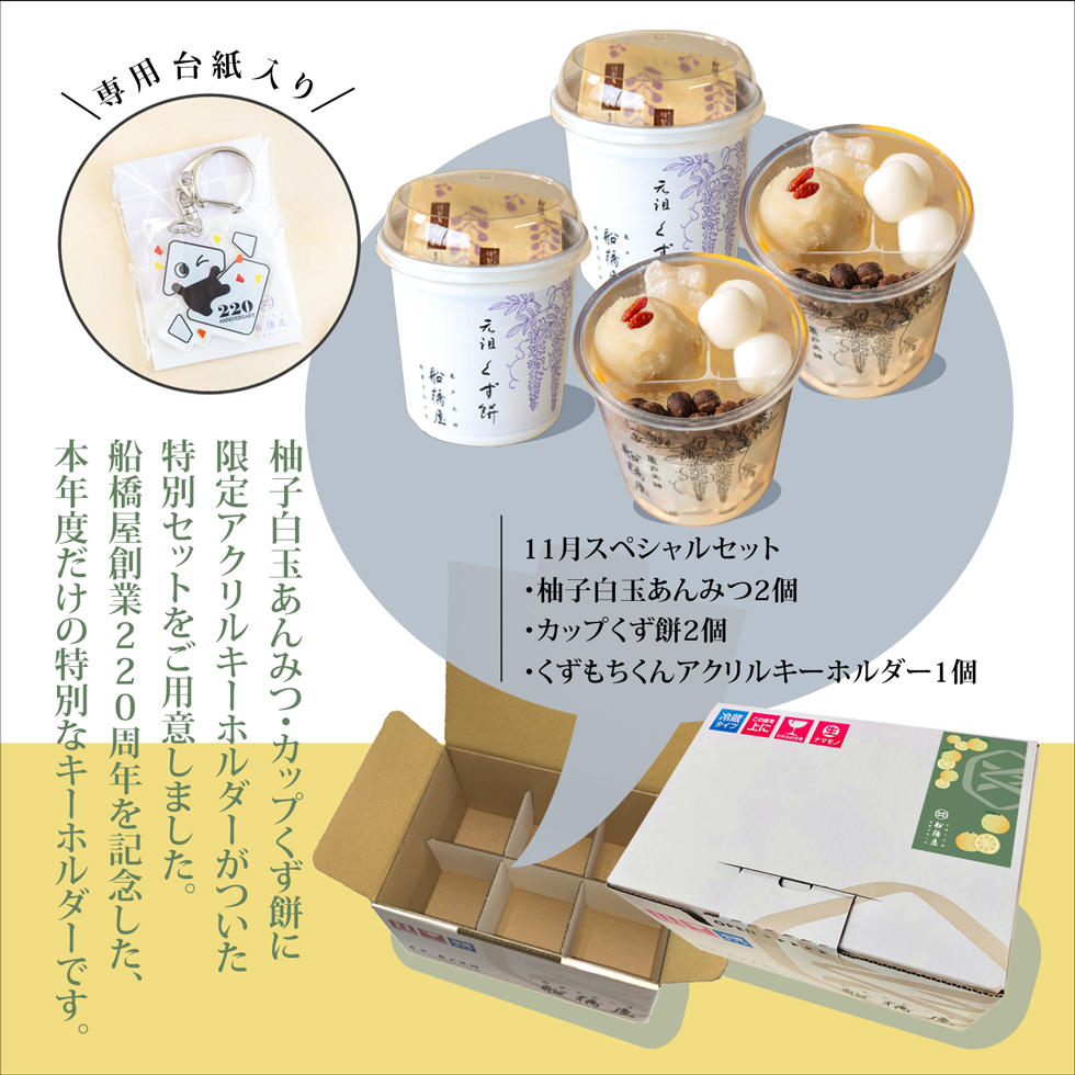 柚子白玉あんみつ2個・カップくず餅2個に、船橋屋220周年限定アクリルキーホルダーがついた特別セット |