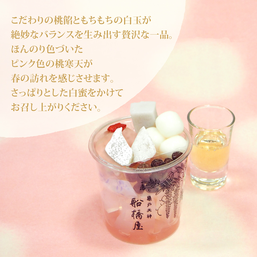 | 原材料名 | 寒天(国内製造)、白桃寒天(寒天、ブドウ糖果糖液糖、もも果汁、砂糖、もも果粒、もも濃縮果汁)、桃餡(生餡、還元水飴、白桃、洋酒、水飴)、糖蜜、求肥、赤えんどう豆、もち米粉、砂糖結合水飴、小麦澱粉、クコの実、食塩、植物油脂/トレハロース、加工澱粉、酸味料、香料、酵素、乳化剤、着色料(野菜色素、クチナシ色素、カロチノイド)