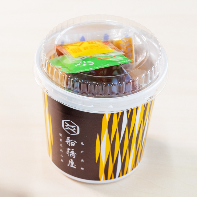 カップの中に入っております酢醤油と青のり、お好みでからしをつけてお召上がりくださいませ。ところてんにはお箸が付きます。