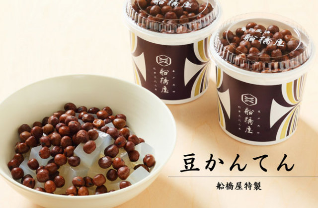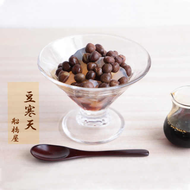 北海道上富良野産の赤えんどう豆をたっぷり使った、船橋屋の豆寒天は赤えんどう豆の塩加減と黒蜜の相性が抜群です。厳選した素材と職人が丹精込めて作り上げた一品をお楽しみください。
