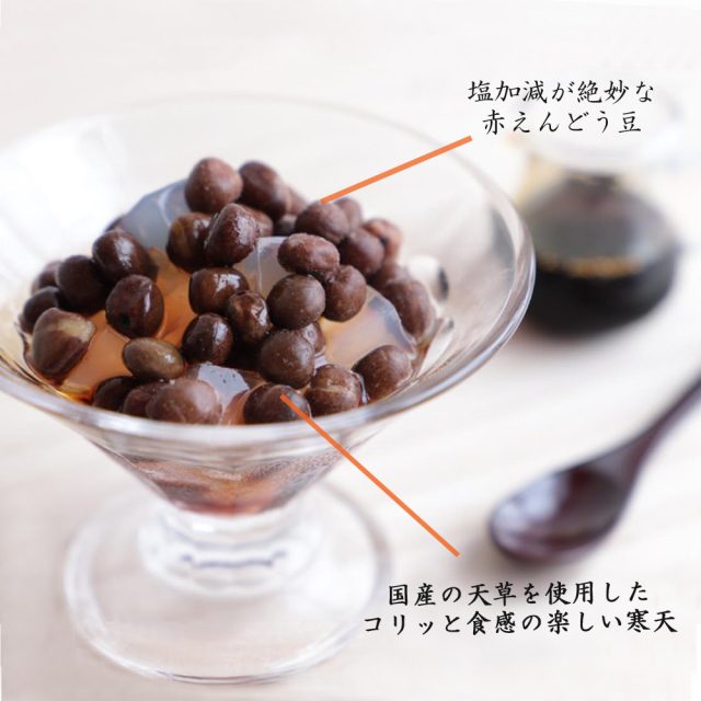 | 寒天は食物繊維を多く含むノンカロリーの健康食品です。当店では全国から吟味した天草を使用しております。赤えんどう豆は北海道上富良野産のものを使用。赤えんどう豆の塩加減と、当店秘伝黒糖蜜の絶妙なバランスを、本物の寒天だけが持つ上質な磯の香りと共にお楽しみ下さい。 |