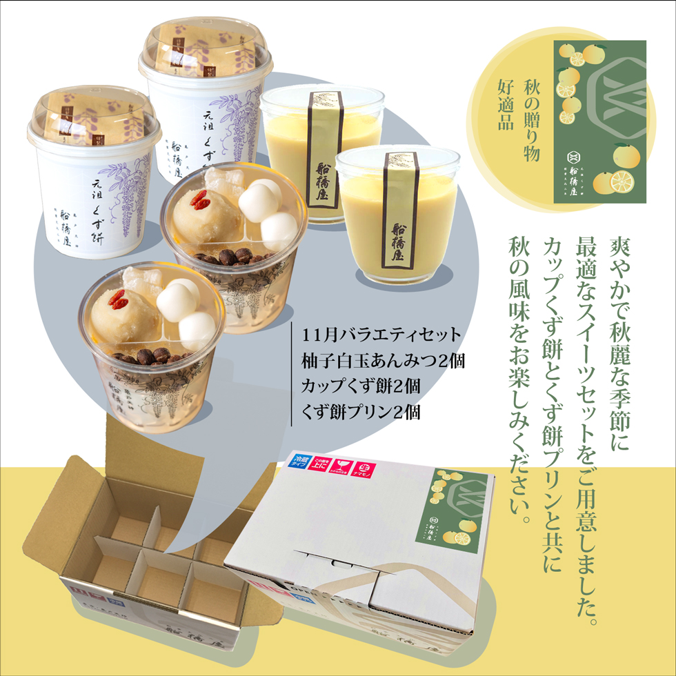 | 商品説明 | 柚子白玉あんみつ2個、くず餅プリン2個、カップくず餅2個の11月限定のセット |